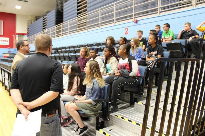 Assistant Superintendent Rob Gress greets Alliance Middle School students at the Career Expo and explains to them how job fairs work before they visit the booths and tables themselves.