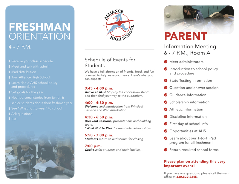 Aug. 14 is Freshmen orientation. From 4-7 p.m. is for students only, parent meeting starts at 6 p.m.